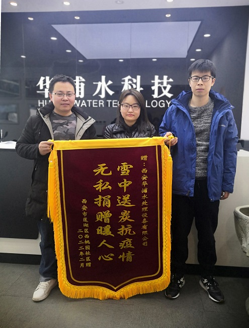2月21日,西安市蓮湖區(qū)西桃園社區(qū)副主任李超和西桃園社區(qū)第二黨支部副書記蒲少鵬來到華浦水科技,他們代表西桃園社區(qū)防疫工作者向華浦水科技贈送了一面印著“雪中送炭抗疫情,無私捐贈暖人心”的紅色錦旗,感謝華浦總裁張玫和生產(chǎn)工程部經(jīng)理張海軍在疫情期間沖鋒在前、助力一線疫情防控,為保障西桃園社區(qū)防疫人員后勤工作所付出的努力和貢獻(xiàn)。