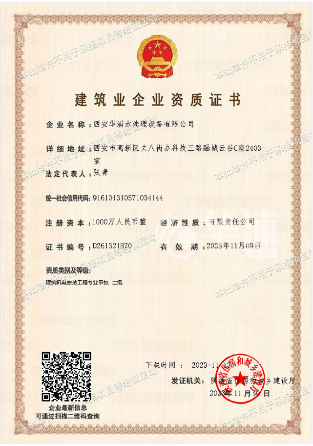 近日,西安華浦環保水處理設備有限公司建筑機電安裝工程資質升為二級。此次資質等級的提升,使我司資質等級和專業水平又上了一個新臺階,進一步增強了公司的市場競爭能力,為公司做大做強打下了堅實的基礎。