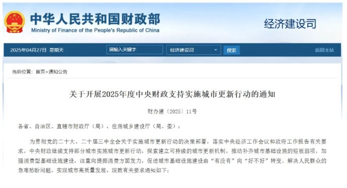 近日,財政部、住房城鄉(xiāng)建設(shè)部發(fā)布《關(guān)于開展2025年度中央財政支持實施城市更新行動的通知》。
