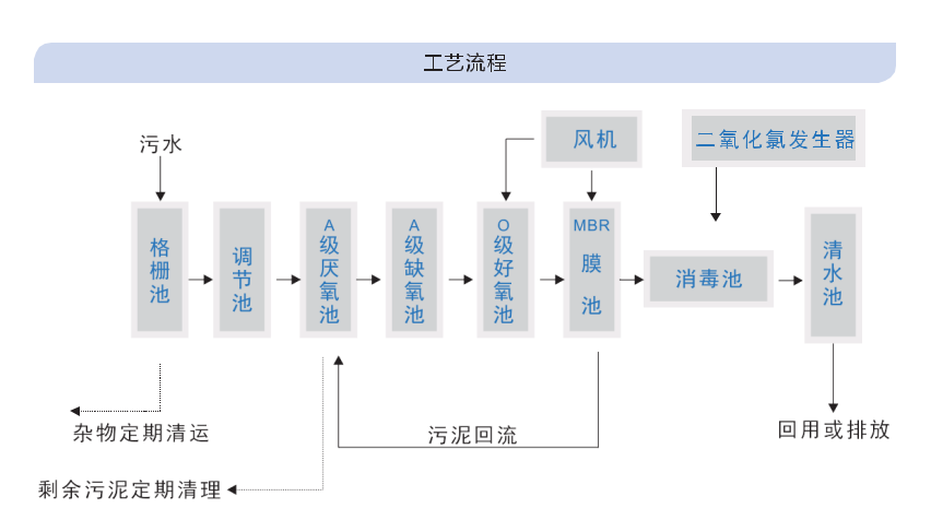 我公司采用成熟的“預處理-酸化水解-兩級接觸氧化-二氧化氯消毒"綜合處理的工藝。廢水通過沉砂、篩網(wǎng)過濾預處理后進入調(diào)節(jié)池,生化處理采用“酸化水解—好氧”,利用微生物多級新陳代謝來降解和去除廢水中的污染物。生化后的污水采用沉淀池進行泥水分離,上清液經(jīng)強氧化劑消毒,達到殺菌的目的,使之達到排放標準。